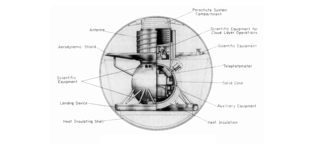 Two days after its release, the insulating sphere began its ballistic descent to the surface at an initial velocity of 10.7 km/sec. As it fell through the raging cloud layers – comprised mostly of sulfuric acid, with wind speeds in excess of 360 km/hr – aerodynamic deceleration slowed the sphere’s velocity to 250 m/sec. At an altitude of 65 km, the parachute compartment opened and a series of drogue, extraction, and decelerating parachutes carried away the sphere’s upper half and slowed the descent to 50 m/sec. The lander’s onboard radio activated and began transmitting data to the orbiter. At an altitude of 62 km, the sphere’s lower half was jettisoned and three large canopy parachutes deployed. Tethered to the parachutes, the now fully-revealed lander descended through the remaining cloud layers for another 20 minutes, while its instruments measured atmospheric composition, wind speed, and photometry. After exiting the clouds at an altitude of 50 km, the parachutes released and the aerodynamic brake, a 2 m disc encircling the lander’s housing, provided resistance to the increasingly dense atmosphere, slowing it to a terminal velocity of 7 m/sec. On impact, the shock-absorbing landing gear crushed against the profile of the uneven terrain, as it had been designed to do so as to anchor the lander in an upright position.